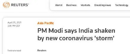 路透社称,连续4天,印度单日新冠确诊病例新增超30万,一再刷新全球纪录;截至当地时间4月25日8时,印度累计确诊病例已逾1696万,累计死亡病例超19万。