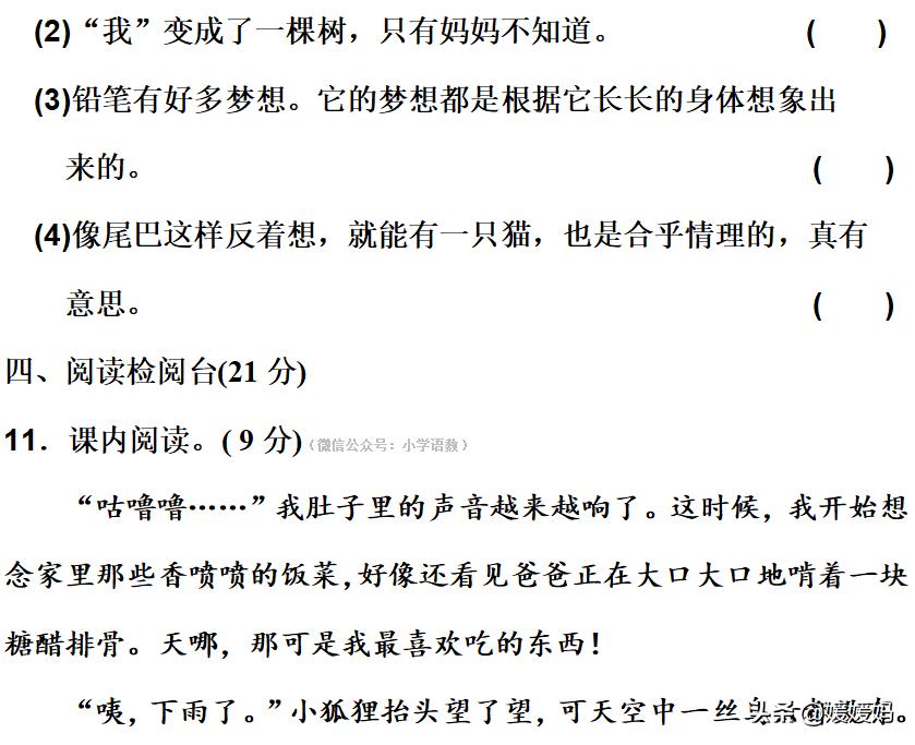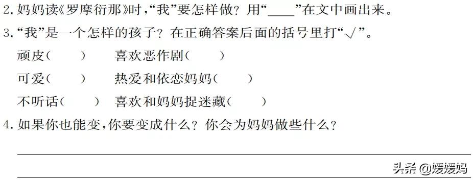 2.《我变成了一棵树》是一篇(童话)故事。作者通过大胆的想象,生动、有趣地描述了“我”变成了(一棵树)之后的故事,体现了(人与自然的和谐)和(深深的母爱)。