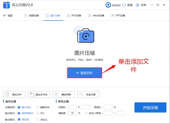 进入图片压缩功能之后,先将需要压缩的图片添加进软件之中。如果图片文件过多的话,可以将整个图片文件夹添加进软件中。添加到软件之后,我们通过调整通用设置,将压缩的图片更符合我们的需求。