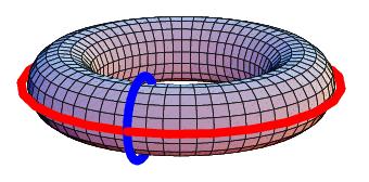 现在从拓扑学的角度来看,我们可以在流形上画一些疯狂的形状然后把这些形状组合在一起,如果它们可以互相变形的话。它们被分成同调类。