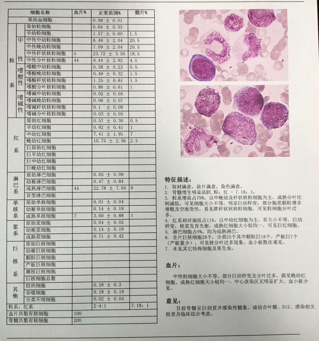 这是一位不幸而又万分幸运的巨幼贫患者,不幸的是失去了还未见面的宝宝,幸运的是自己诊断治疗及时而康复。诊断巨幼贫还需叶酸、B12的检查,但本患者病情危重,骨髓形态学诊断明确,治疗效果明显好转,是一例少见的特殊临床病例。希望通过该病例的报道,给备孕和准妈妈们一些提醒,关注巨幼贫,宝宝妈妈都康宁。