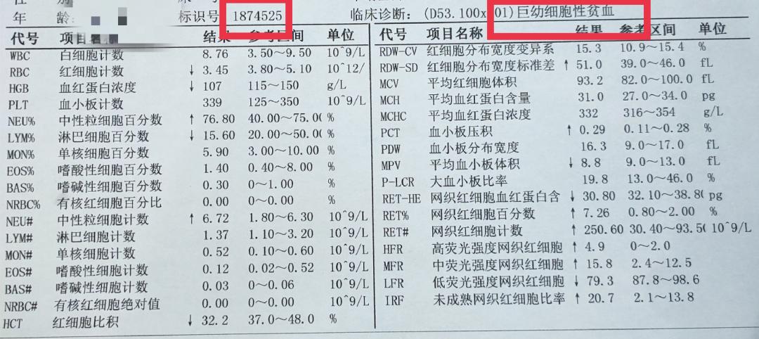 患者出院一个月后复查血常规三系正常巨幼贫治疗后痊愈。