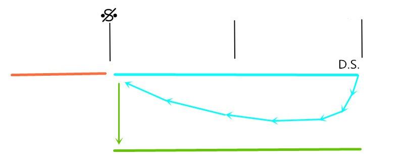 D.S.记号是Da?Segno的缩写,意为“从有记号处反复”。在反复的过程中从标有&34;·$·&34;的符号处开始反复,而不是全段反复。