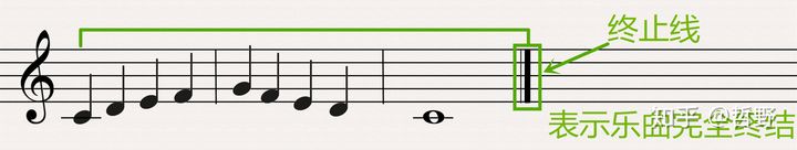 终止线是代表全曲“曲终”的线,由一粗一细两根纵线构成,是表示曲子完全完结的符号。