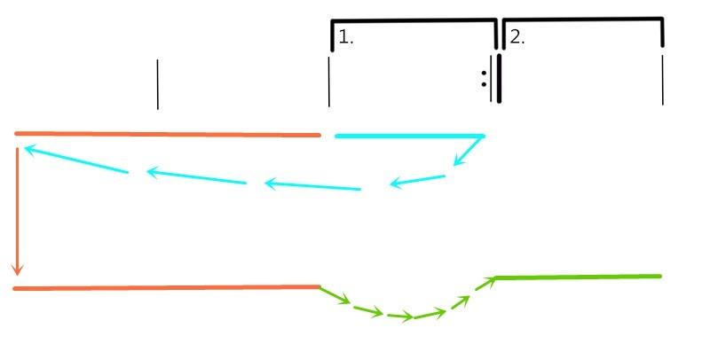 “反复跳跃记号”的书写方式除了要用到“段落反复记号”外,还要在需要跳过和跳过后演奏的小节上方横向放置一个方括号,并在对应的方括号内加上数字标明属于第几个线段。