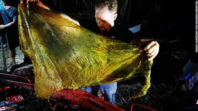 菲律宾达沃市自然历史博物馆的馆长海洋生物学和环保主义者达雷尔·布拉奇利接到一个报告,在孔波斯特拉谷省的马比尼半岛一头鲸鱼被冲在海滩上,布拉奇利的团队把尸体带回了博物馆,对尸体进行了解刨检查,发现鲸体内发现40公斤的塑料袋,包括米袋、杂货袋等等,有些塑料袋已经钙化,这头鲸鱼的死亡原因完全是因为这些塑料袋。