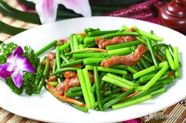 材料:猪肉,蒜苔、植物油,盐,鸡精,葱姜蒜,酱油