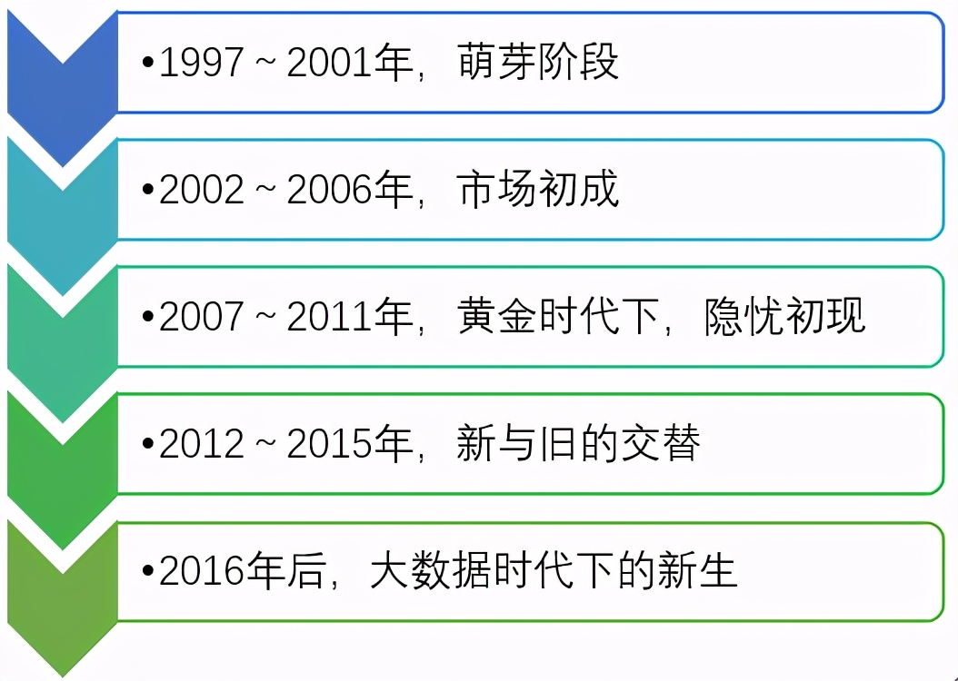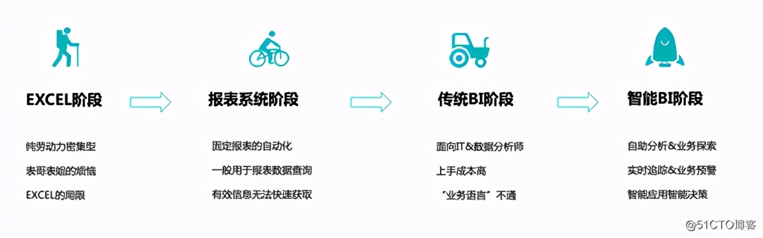 国内 BI 工具萌芽期是 97、98 年至 2000 年左右,这期间有先见的一些 IT 人开始从事商业智能领域的研究、摸索与实践。最开始企业只是想通过其提高做数据分析这项工作的效率,后来,更多企业的目的是为了提高做决策的效率和科学性,以结果为导向。BI的发展可以理解为从数据分析工具到深入场景的“智能决策大脑”的演进。