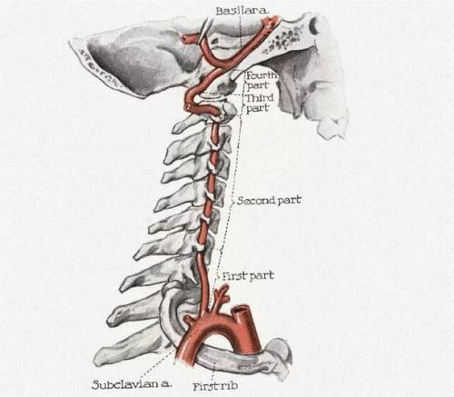 3.椎动脉型颈椎病:由于颈椎退变机械性压迫因素或颈椎退变所致颈椎节段性不稳定,致使椎动脉遭受压迫或刺激,椎动脉狭窄、迁曲或痉挛造成大脑椎基底动脉供血不全,出现头晕、恶心、耳鸣、偏头痛等症状,或转动颈椎时突发眩晕而猝倒。因椎动脉周围有大量交感神经的节后纤维可出现自主神经症状,表现为心悸、心律失常、胃肠功能减退等。但是也有人认为骨赘或椎间盘突出引起的压迫,难以阻断椎动脉血运而引起眩晕及猝倒。
