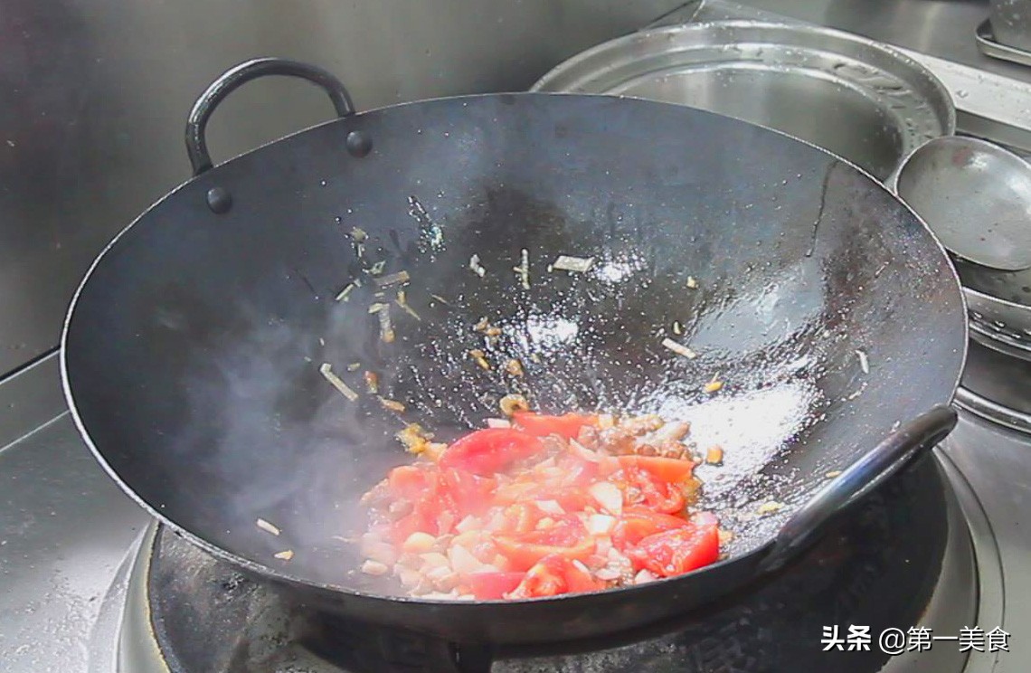 倒入西红柿和洋葱,快速翻炒出西红柿的汁水,倒入半勺番茄酱,翻炒均匀。