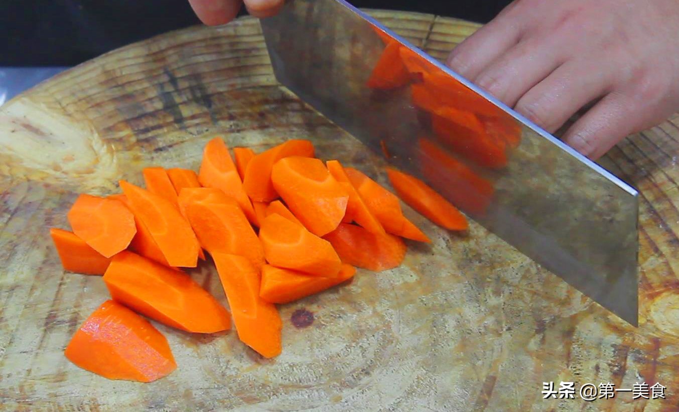 准备胡萝卜一个,削去外皮,切成滚刀块,放在碗里备用。
