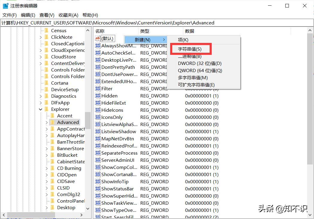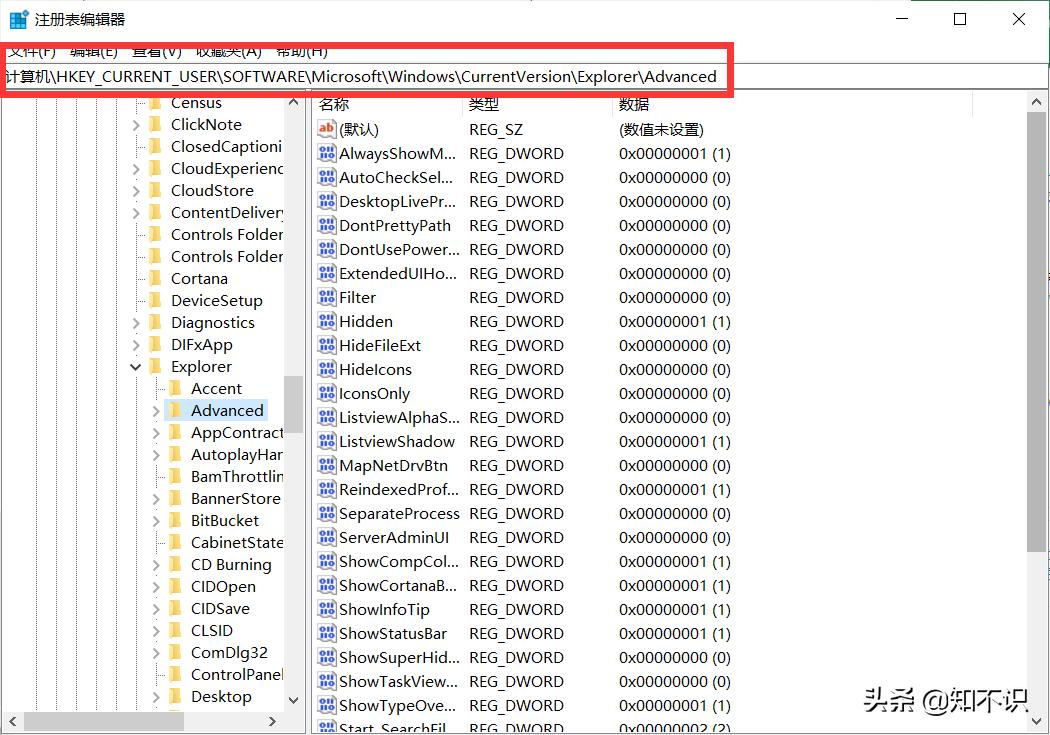 步骤二:查找,计算机HKEY_CURRENT_USERSOFTWAREMicrosoftWindowsCurrentVersionExplorerAdvanced路径;