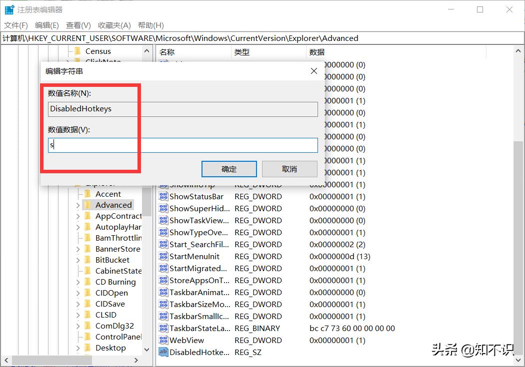 步骤四:设置数值名称为【DisabledHotkeys】,数值数据为【S】,之后重启电脑即可。