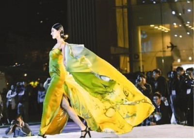 身着云锦时装的模特,优雅地展现古典与时尚的融合。