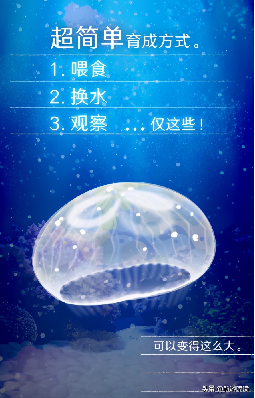非常简单的一款养水母的小游戏,你只需要每天给他喂食,一周换一次水,然后看着水母长大即可。以前小时候也养过水母,可惜没养活,所以这个游戏算是能圆一个我养水母的梦。