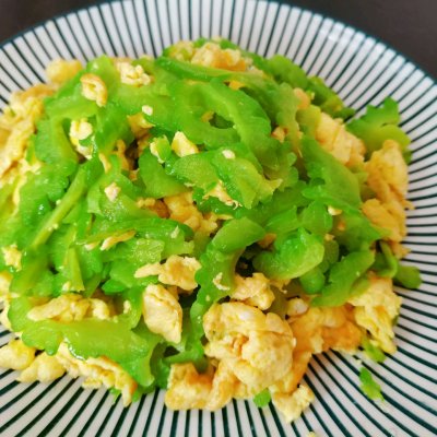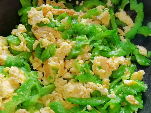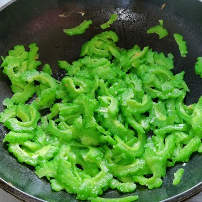 5、苦瓜炒至九分熟,下入鸡蛋,再加入一点盐,知道鸡蛋的香味和苦瓜的清香味儿完全融合,盛出。