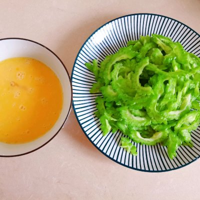 2、鸡蛋打散,苦瓜切片备用。(不喜欢苦瓜的苦味和涩味可以用盐腌制15到20分钟,再清洗干净即可。)