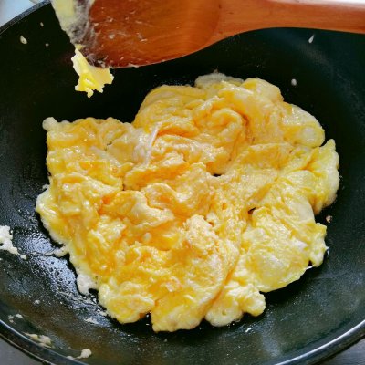 3、锅内烧油。由全热倒入鸡蛋炒好盛出备用。(不要鸡蛋炒好了直接倒入苦瓜,很容易鸡蛋老了苦瓜还没炒熟;也不要先炒苦瓜再倒入鸡蛋液,不然这样炒出来的苦瓜炒鸡蛋粘成一坨,既不好吃也不好看。)
