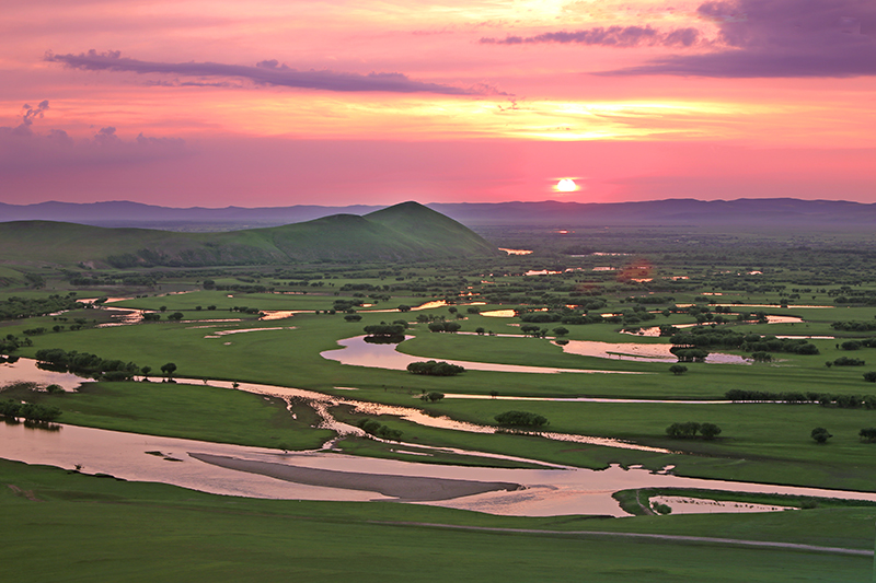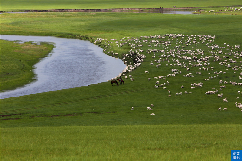 流连老舍笔下的莫日格勒河是一条河道十分狭窄,但却极度弯曲的河流。从空中俯瞰,蜿蜿蜒蜒的河水,就象是一条被劲风舞动着的蔚蓝色绸带,悠然飘落在碧绿如玉平坦无垠的大草原上,其弯曲程度,用九曲十八弯来形容是远远不够的;它顺流逆流,对流倒流,往往返返,迂回曲折,顾盼流连,忘情地抚弄着草原的肌肤,全部流程几乎都是在弯曲的流动中完成的,如诗的婉约韵律,如画的飘逸线条,如歌的跳跃音符,如书法的酣畅墨意。莫日格勒河之曲,却纯粹是大自然的天工造化,没有一点儿斧凿之处是真正的原生态景观。