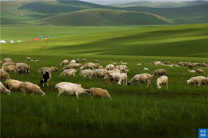 白色的羊群在山坡上吃草。远远望去,好像是白云飘浮在山间,又好似一粒粒珍珠撒落在草原上。 微风吹过,草浪滚滚,形成了一片绿色的海洋。牧羊的姑娘,唱着动听的情歌,挥动着羊鞭,游走在美丽的草原上。傍晚,夕阳西下的时候,在霞光的辉映下,草原与天连成一片。蒙古包里响起了委婉动听的马头琴声,这动与静相结合的草原美景,怎不叫人心旷神怡。