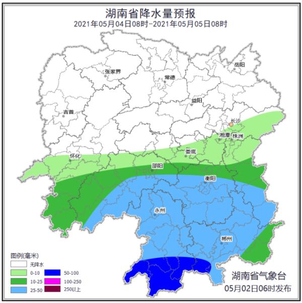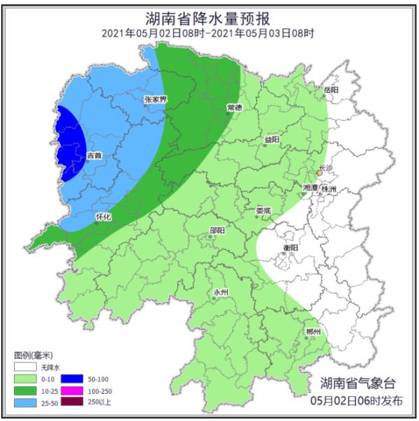 5月2日晚,湘西、湘西北多云转中等阵雨或雷阵雨,湘西州、 张家界、怀化中北部部分地区大雨,其中龙山、保靖、花垣、 凤凰、吉首局地暴雨,湘东晴天转多云,其他地区多云转阵雨或雷阵雨;南风4级,雷雨时局地阵风7级。最高气温湘西、湘北30~32℃,其他地区32~34℃,最低气温湘西、湘北17~19℃,其他地区21~23℃。