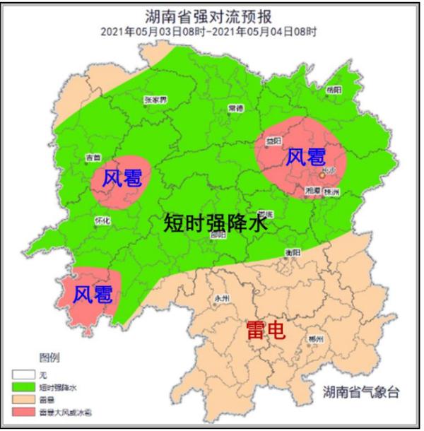 预计,3日,全省大部有雷电活动,湘西、湘中及以北地区有 短时强降水发生,其中长沙、湘潭、株洲北部、益阳、岳阳、 怀化、湘西州南部、邵阳西部的局地有风雹天气。
