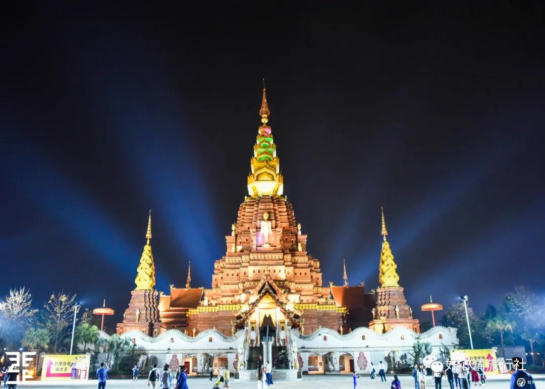 雄伟的景洪大金塔,塔身高66.6米,寓意一江连六国(中国、老挝、缅甸、泰国、柬埔寨和越南),在夜晚更加的辉煌耀眼,不禁让人流连忘返,仿佛置身在泰国。