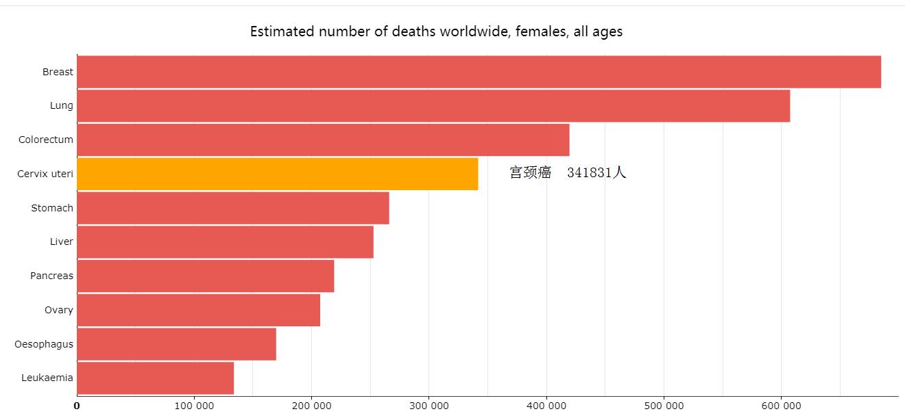 有341831名女性死于宫颈癌,仅次于乳腺癌(684996人)、肺癌(607465人)和结肠直肠癌(419536人),是女性癌症死亡的第四大原因。