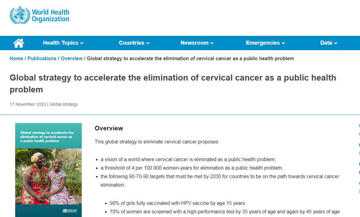 2020年11月17日,世卫组织正式启动了《加速消除宫颈癌全球战略》,包括我国在内的194个成员国承诺共同努力来现实消除宫颈癌的战略目标。