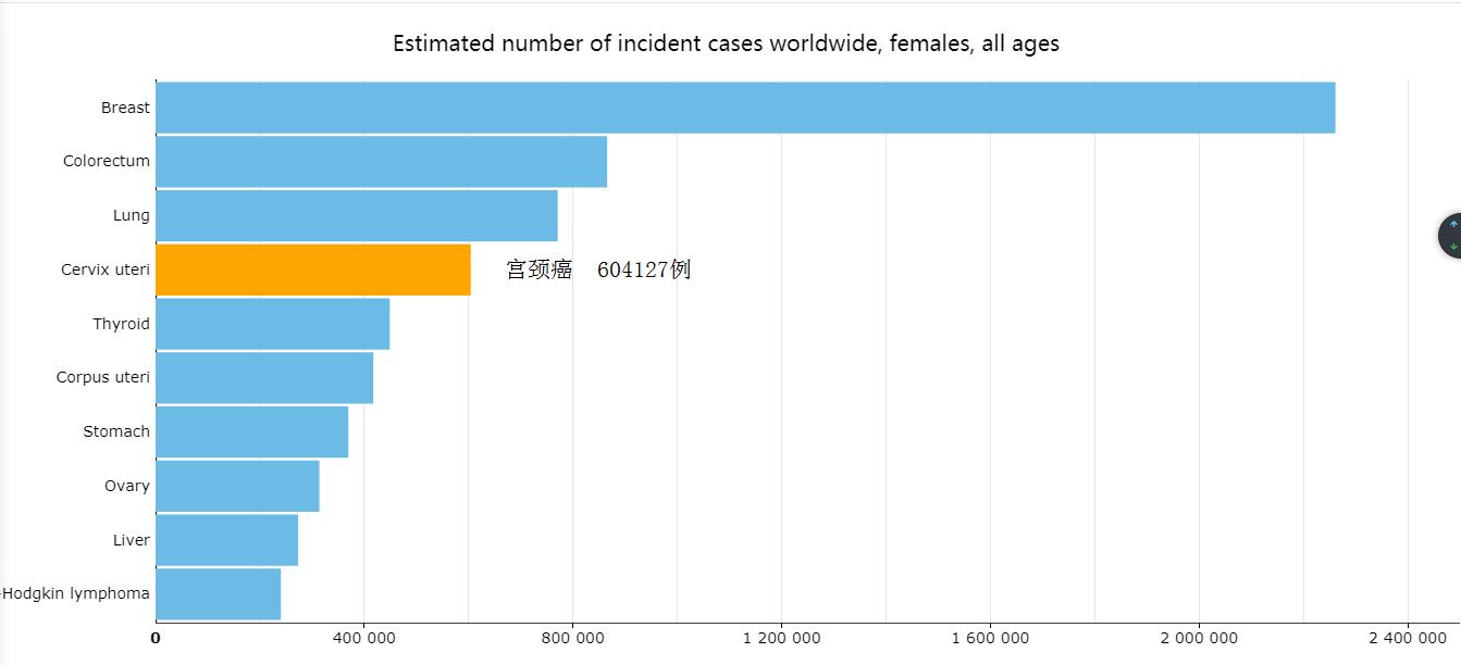 根据国际癌症研究机构(IARC)全球癌症观察数据库最新资料,2020年全球共发生宫颈癌604127例,仅次于乳腺癌(2261419例)、结肠直肠癌(865630)和肺癌(770828例),列在女性癌症的第四位;