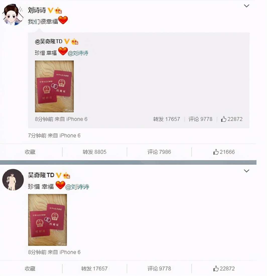 2015年吴奇隆晒出结婚证,官宣与刘诗诗已经结婚