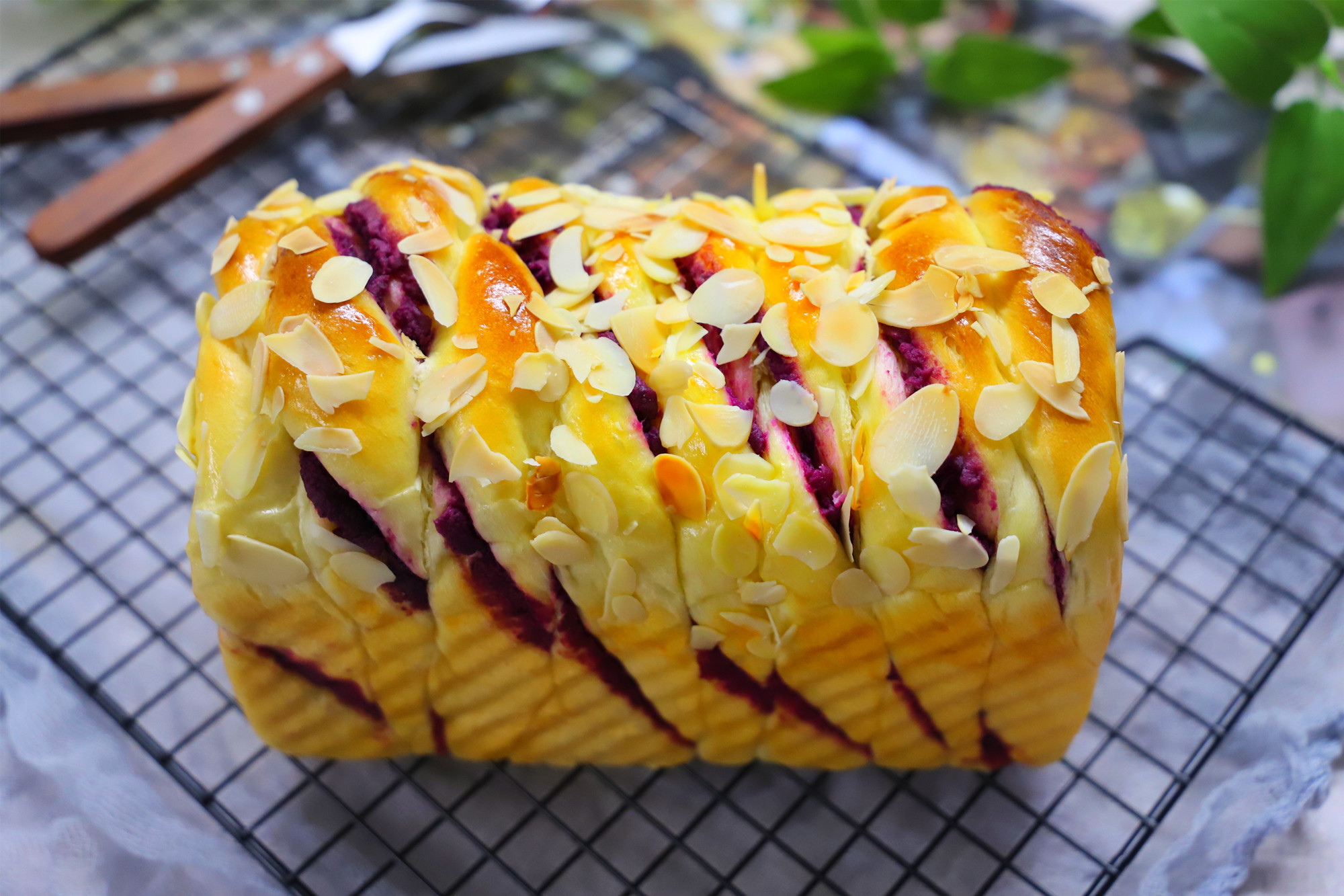 【材料】:面包粉250克,酵母2.5克,糖30克,盐3克,奶粉10克,蛋液25克,牛奶146克,黄油25克,紫薯泥适量,杏仁片适量
