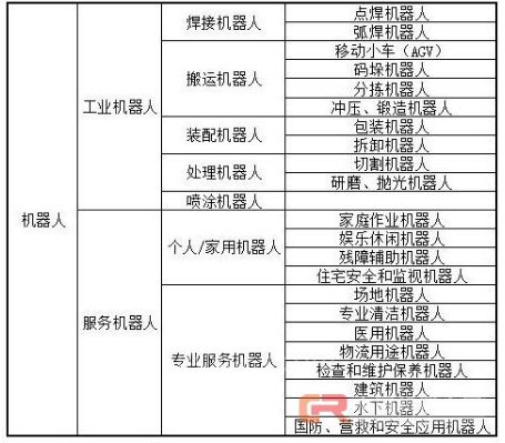 我国机器人专家将机器人分为工业机器人和特种机器人两大类。所谓工业机器人就是面向工业领域的多关节机械手或多自由度机器人。而特种机器人则是除工业机器人之外的、用于非制造业并服务于人类的各种先进机器人,包括:服务机器人、水下机器人、娱乐机器人、军用机器人、农业机器人、机器人化机器等。在特种机器人中,有些分支发展很快,有独立成体系的趋势,如服务机器人、水下机器人、军用机器人、微操作机器人等。特种机器人属于非制造环境下的机器人,这和国外的服务机器人逻辑上是一致的。