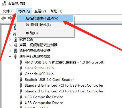 6. USB大容量存储设备消失后,单击上面的“操作”,弹出“扫描检测硬件更改”。
