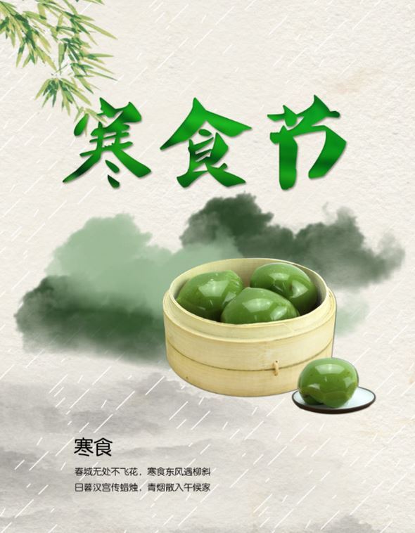 寒食节又叫禁烟节,一般是在清明节的前一天或者前两天,从冬至开始算,冬至后第105天就是寒食节。在寒食节和清明节这几天,按照习俗是要吃冷食的,家里不可以生火做饭。