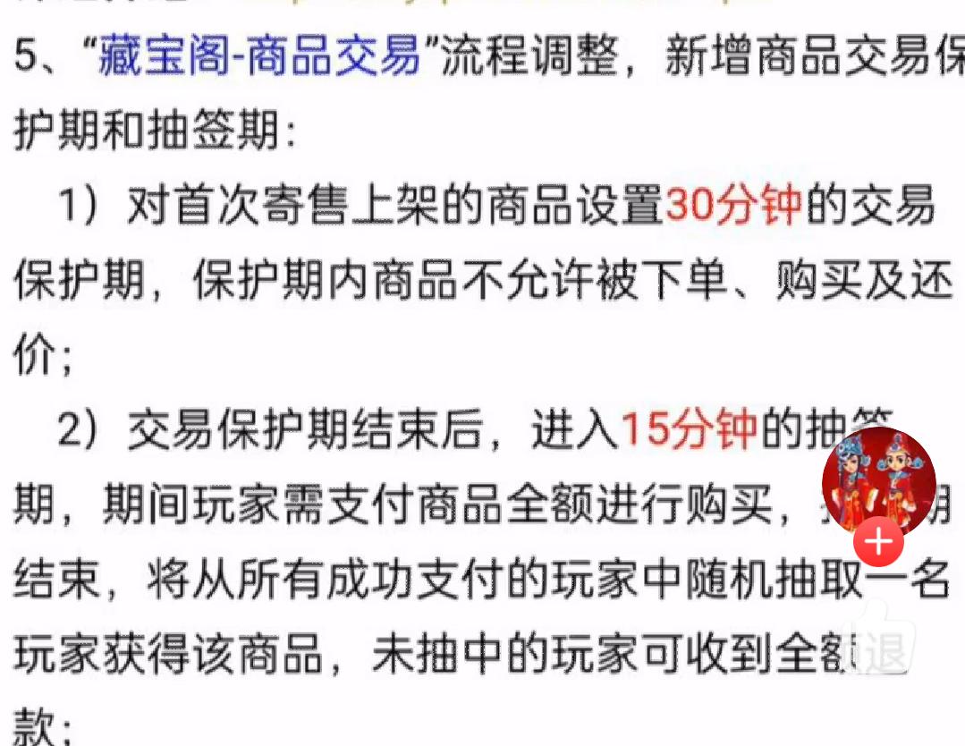 18年藏宝阁更新宝宝跟道具增加一个格子,我称之为扩容。当时我在怀疑是不是后台数据监测物品流动太慢,市场停滞停下了部分业务。实际市场反馈良好,20年藏宝阁更新再次扩容,给我的直观感受还是市场出了问题,但是市场效果依旧良好。而21年对藏宝阁进行了两次更新,第一次更新,藏宝阁公示期无需等待。第二次更新就是目前藏宝阁抽签机制。这是我印象中藏宝阁4次重要更新。