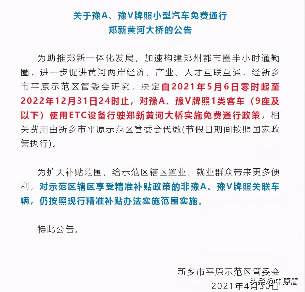 对豫A、豫V牌照1类客车(9座及以下)使用ETC设备行驶郑新黄河大桥实施免费通行政策,相关费用由新乡市平原示范区管委会代缴(节假日期间按照国家政策执行)。