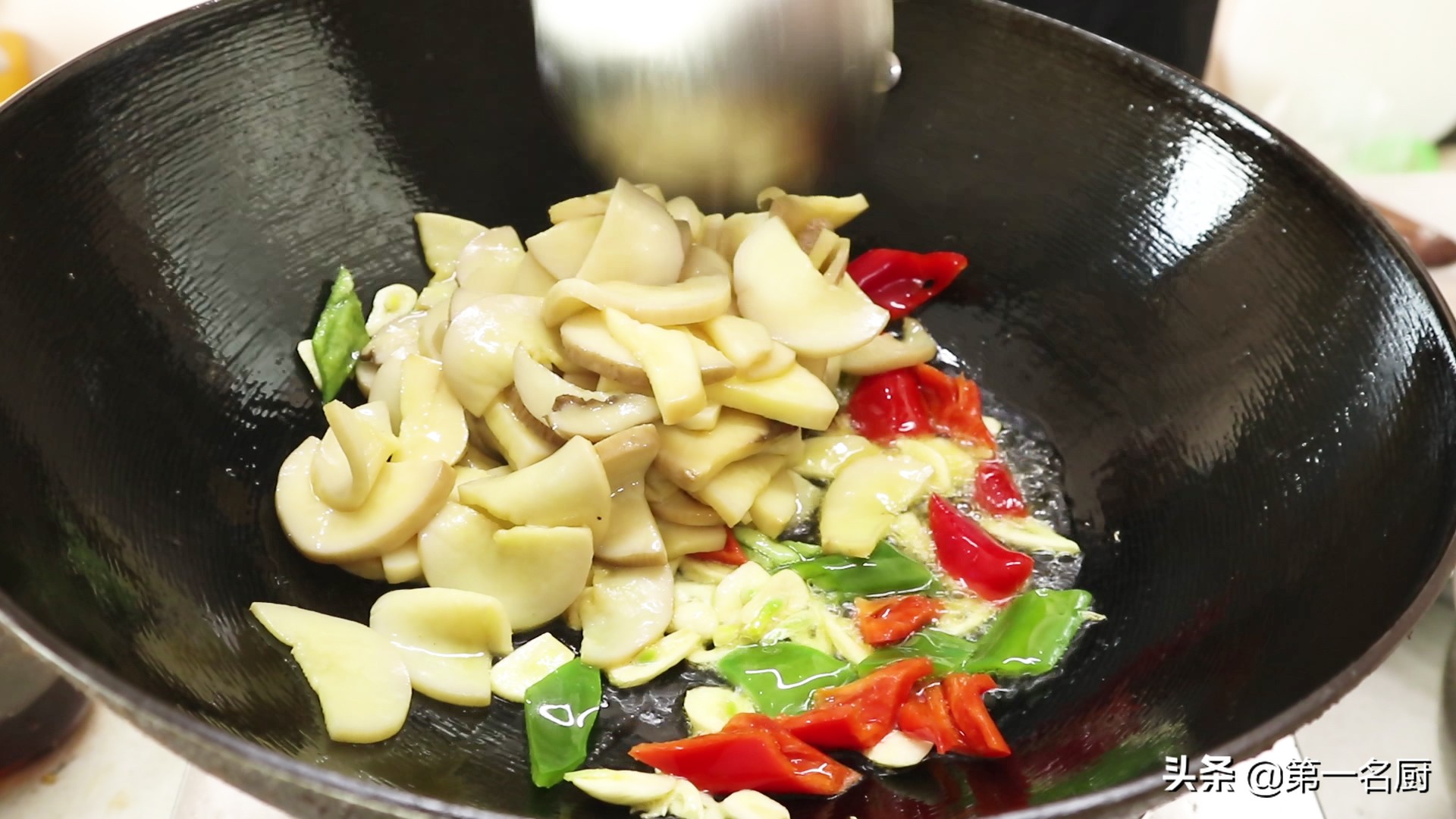 5.炒锅烧热,倒入食用油,油温五层热时下入切好的杏鲍菇。