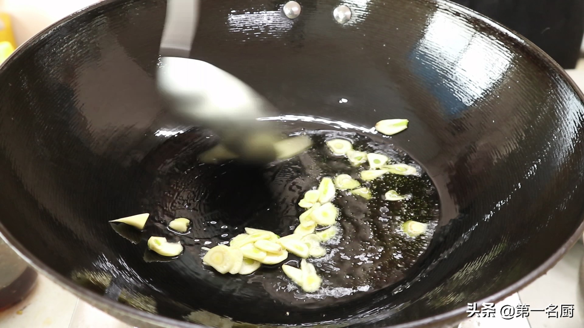 8.锅中再加入少许食用油,倒入蒜片爆香。