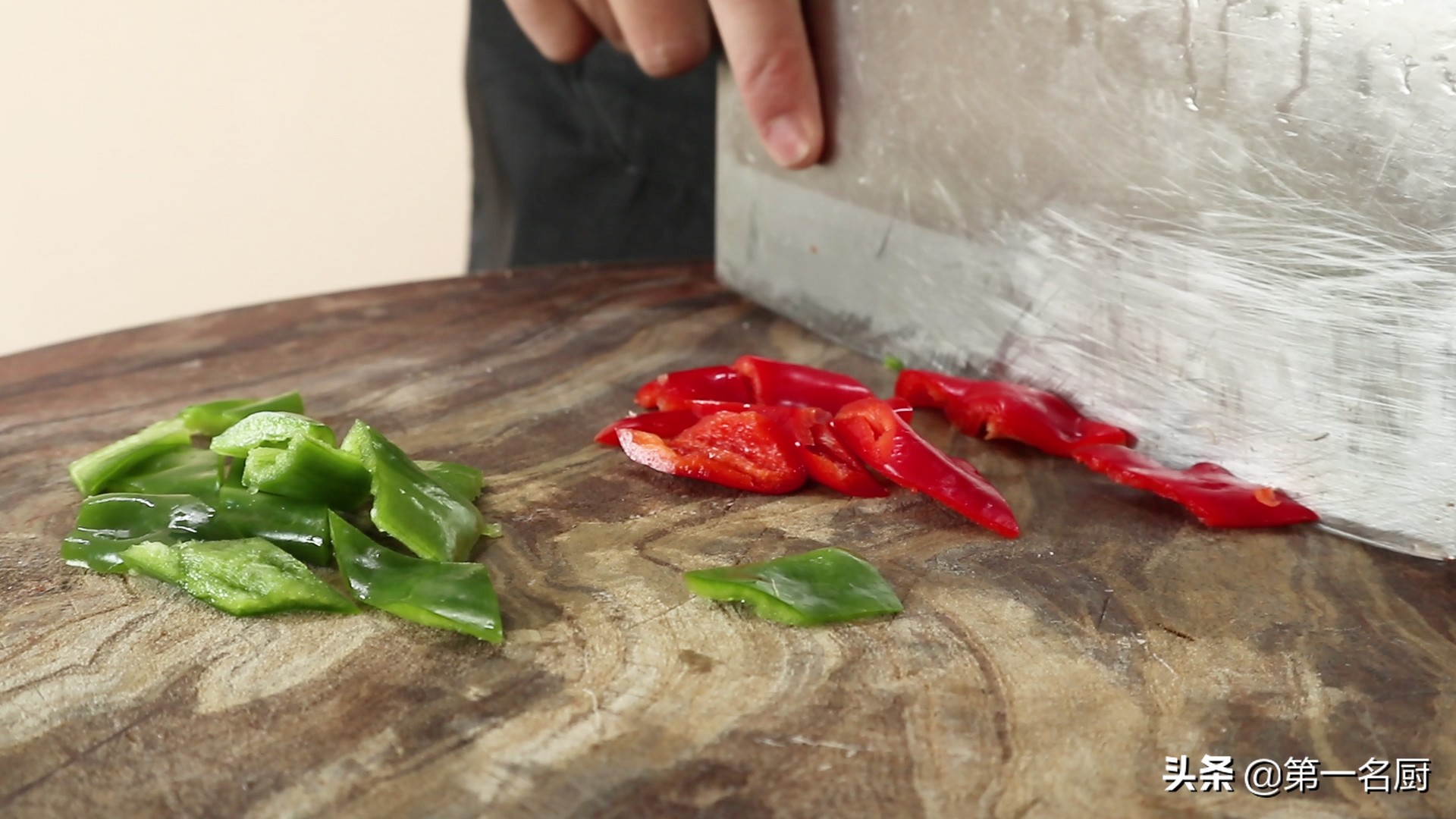 2.接下来切一点配料,青红椒各半个,先切成条,再切成菱形片,一起放入盆中用来配色。