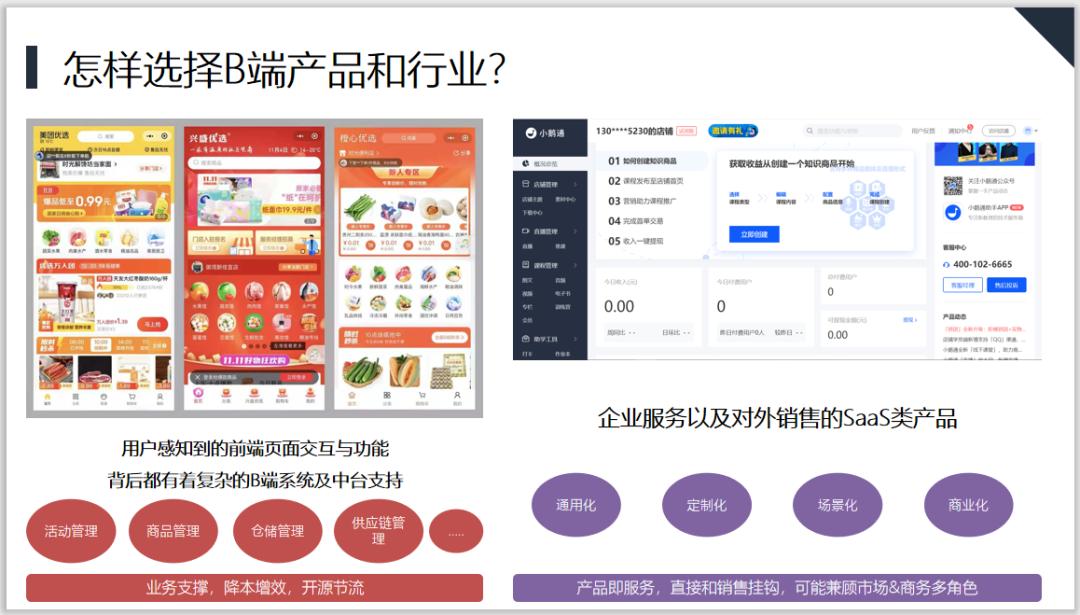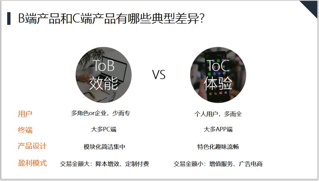 那么B端产品究竟和C端产品有哪些典型的差异呢?核心主要表现在2个方面,B端更加侧重效率和产能,C端则更注重流量和用户体验。