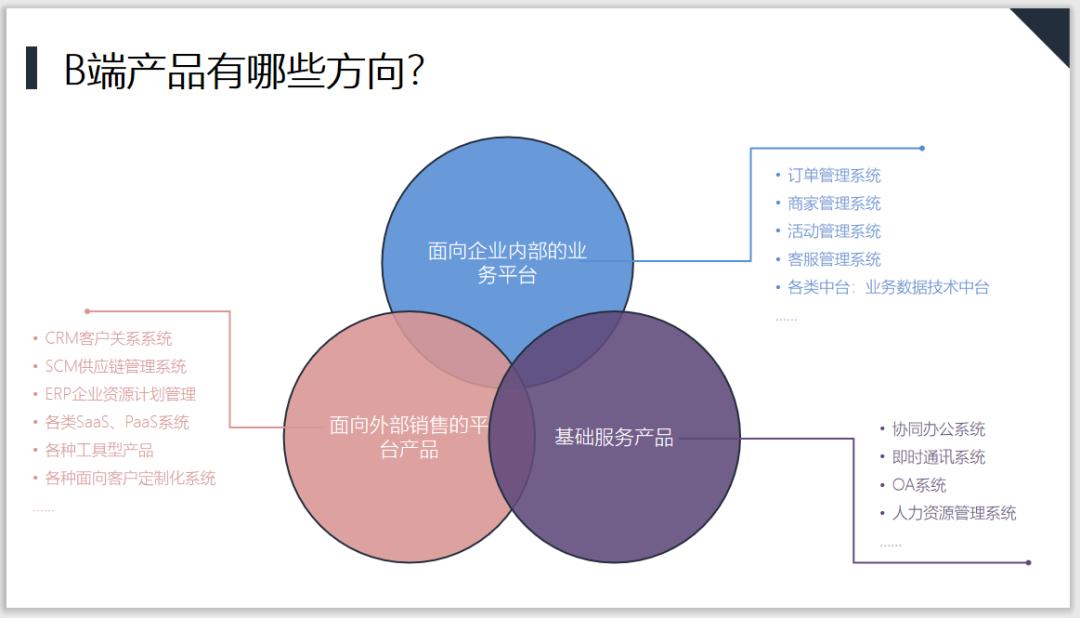 既然想要转型B端产品,那就应该了解一下目前在B端市场具体有哪些类型的产品,其实在分类上有很多不同的归纳,以下这三个方向是我结合自己的理解和认知划分的。
