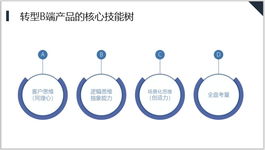 第一是客户思维,第二个是逻辑思维与抽象能力,第三个则是场景化思维,最后一个就是全局考量,里面有一些是和C端是相通的,具体来看这个4个能力包含哪些方面。