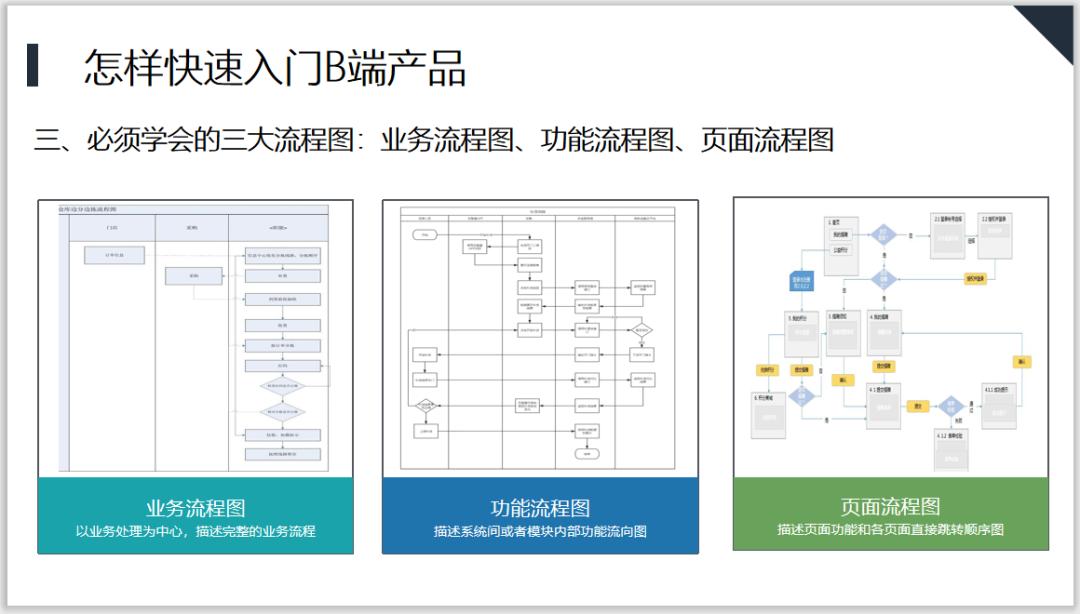 第三,必须学会的三大流程图:业务流程图、功能流程图、页面流程图。
