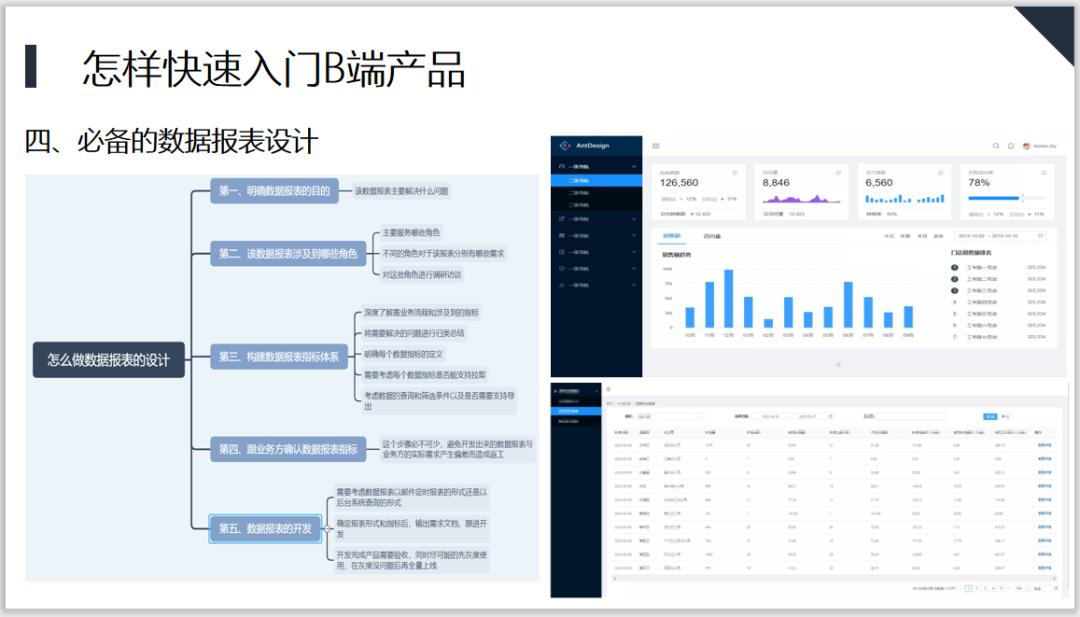 做B端产品我们还会涉及到一个基本所有行业都会涉及到的一个能力,就是数据报表设计的能力,数据报表包括2个维度,一个维度是数据看板或者数据工作台,有些公司可能会有对应的数据产品,但是绝大多少B端产品,为了监控自己业务,需要设计对应的数据报表去进行监控,业务同事也需要对应的工具去观测业务是不是好的,所以这个能力也是我们必须需要具备的。这里我们可以使用一些成熟的元件库,antdesign,饿了么等元件库;我们在设计数据报表时需要考虑以下方面:明确报表的目的,涉及哪些角色、构建数据指标体系,跟业务方确认,最后才是数据报表的开发。