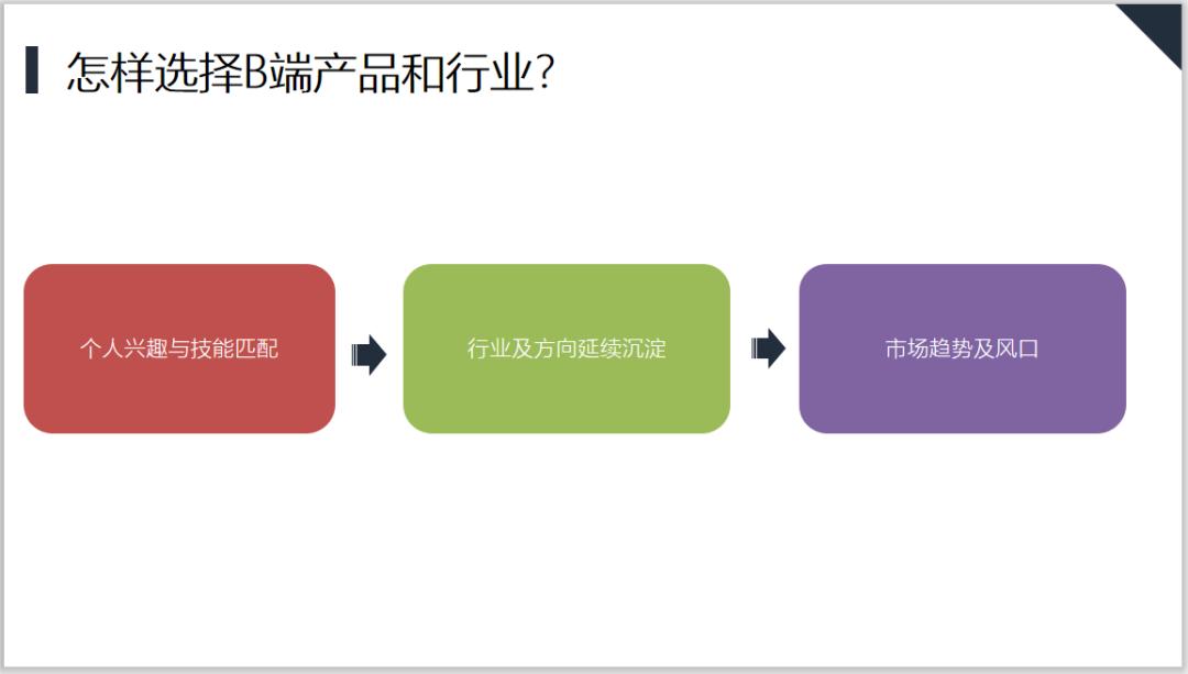那么面临这么多可供选择的B端方向和行业,我们应该怎么去选择适合自己的的方向呢?我觉得主要有以下3个方面需要考虑: