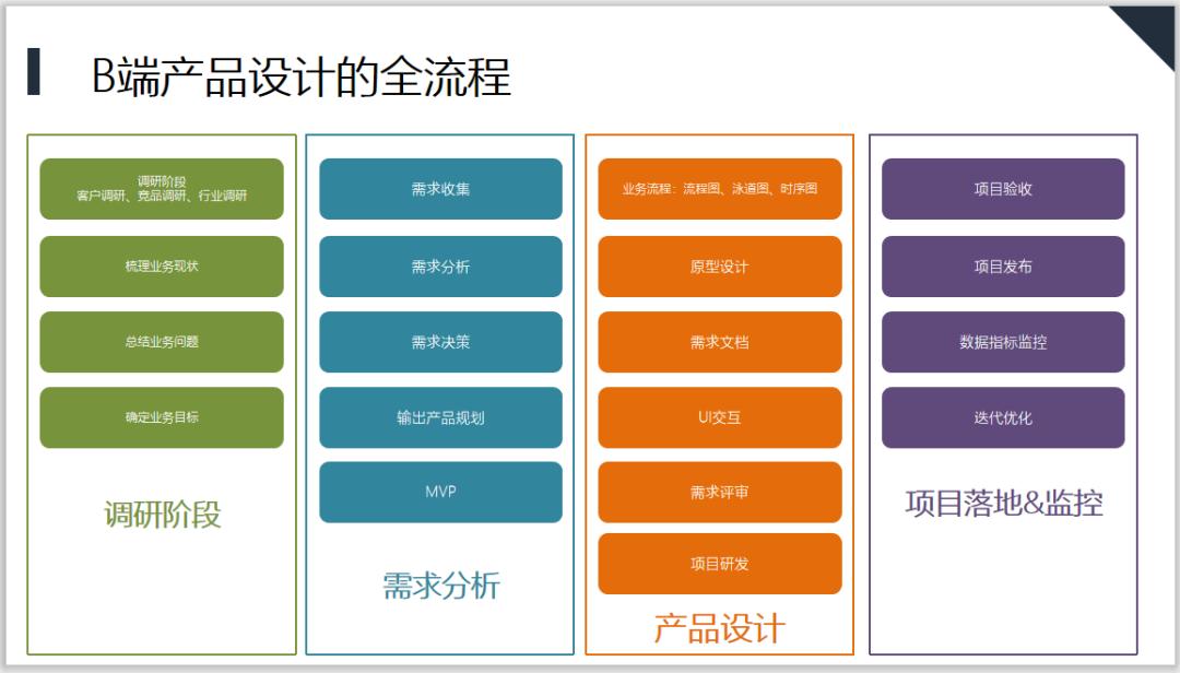 其实B端产品设计的全流程和C端并没有太大的差异,只是在具体某些环节中会有一些区别和差异,这个我们其实可以当做一个通用的产品设计或者项目管理流程去理解就好,但是说一句,这些里面的环节,大家都应该积累自己的方法论,每个环节其实都有对应的经验,只是不同行业和场景下会有不同的解法,需要我们自己去积累。