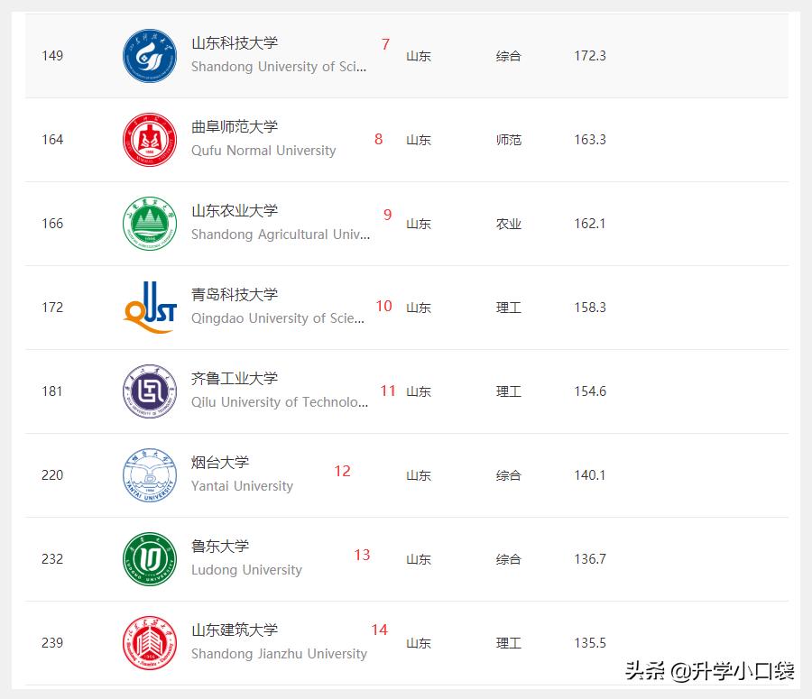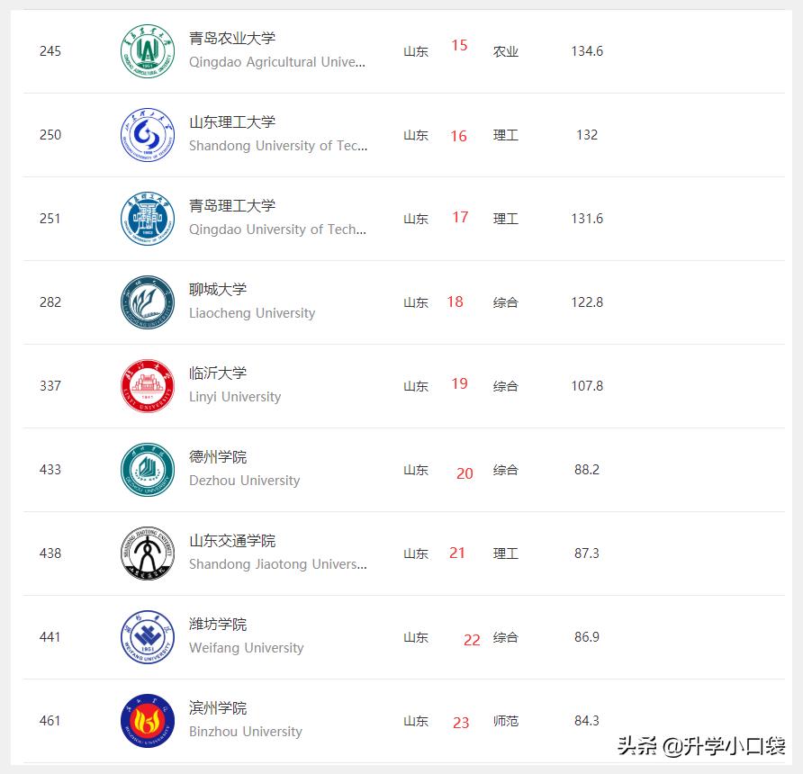 以上就是山东省32所学校的排名情况。这个排名是学校的综合实力排名,学校排名和学科排名不同,学科排名以学科为准。排名靠前的学校并非所有的学科都是优势学科,例如中国海洋大学在山东省排名第二,但是学校的海洋科学和水产学两个学科在全国排名第一。