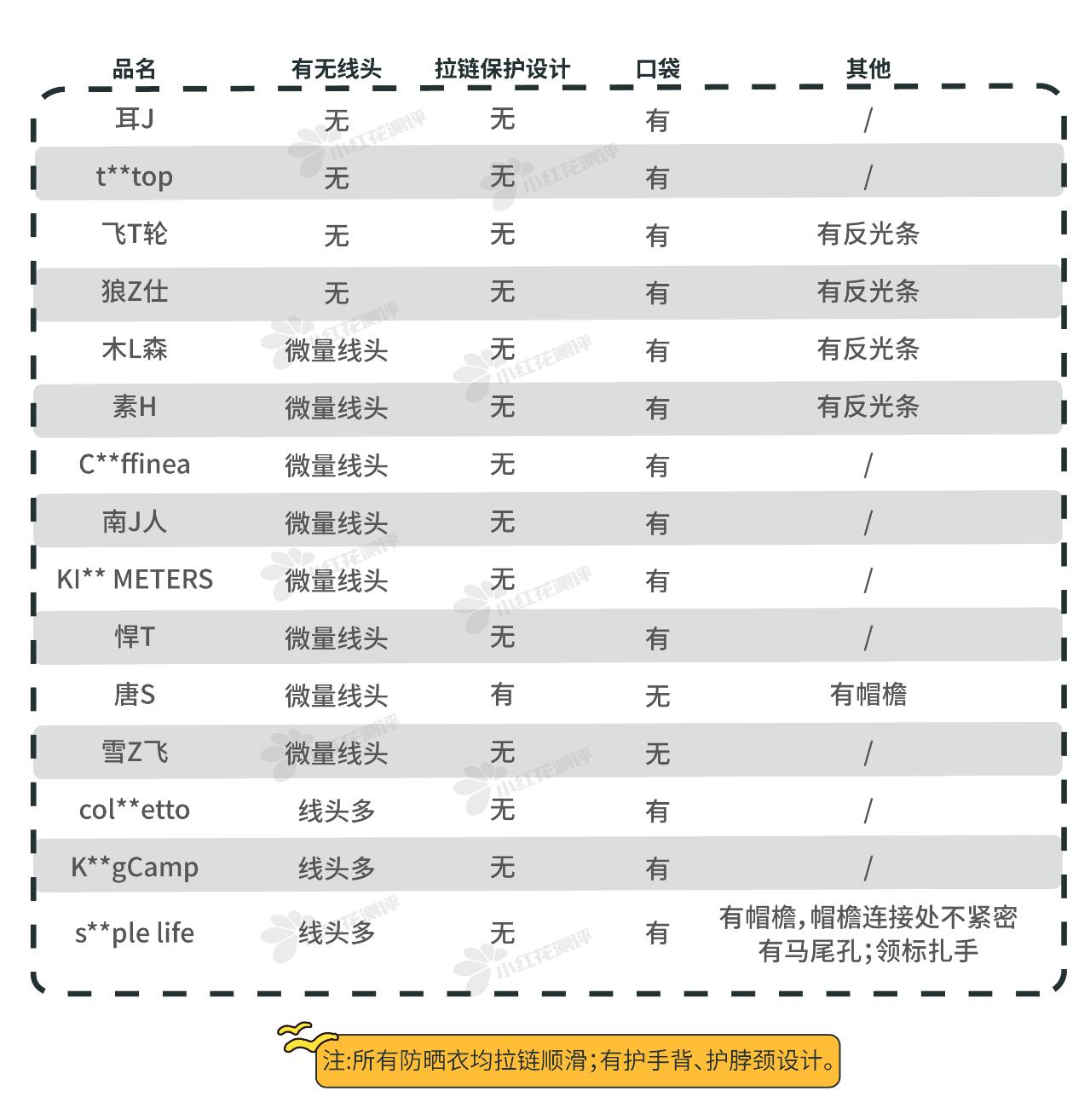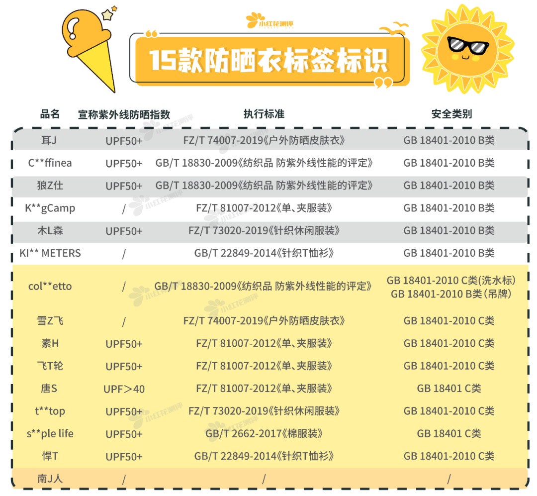1.仅耳J 、C**ffinea、狼Z仕、col**etto、雪Z飞执行了防晒衣相关标准。