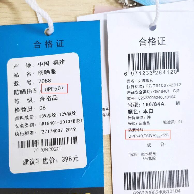 检查防晒衣的吊牌、耐久性标签,上面要包括名称、款号、材质信息、执行标准、安全类别等,才算是规范的标示。